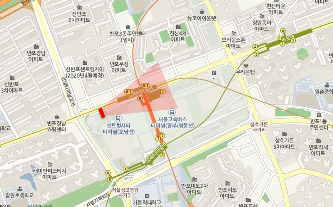 반포 고속터미널은 전국을 연결하는 국내 최대 버스터미널 입니다. 터미널 1일 이용객 5만명이며 지하철 3,7,9호선이 환승