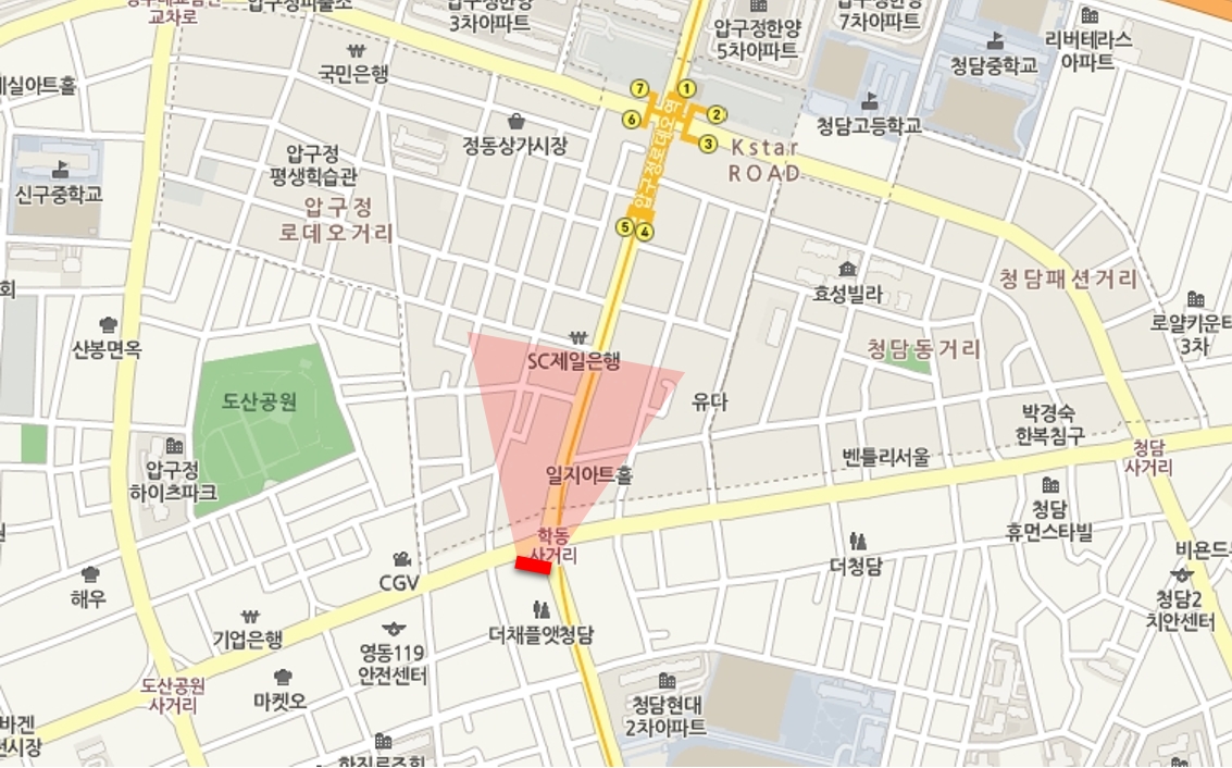 도산대로와 선릉로의 교차로 학동사거리에 설치되어 있으며 상습적인 교통체증이 발생되기 때문에 많은 차량들에게 노출