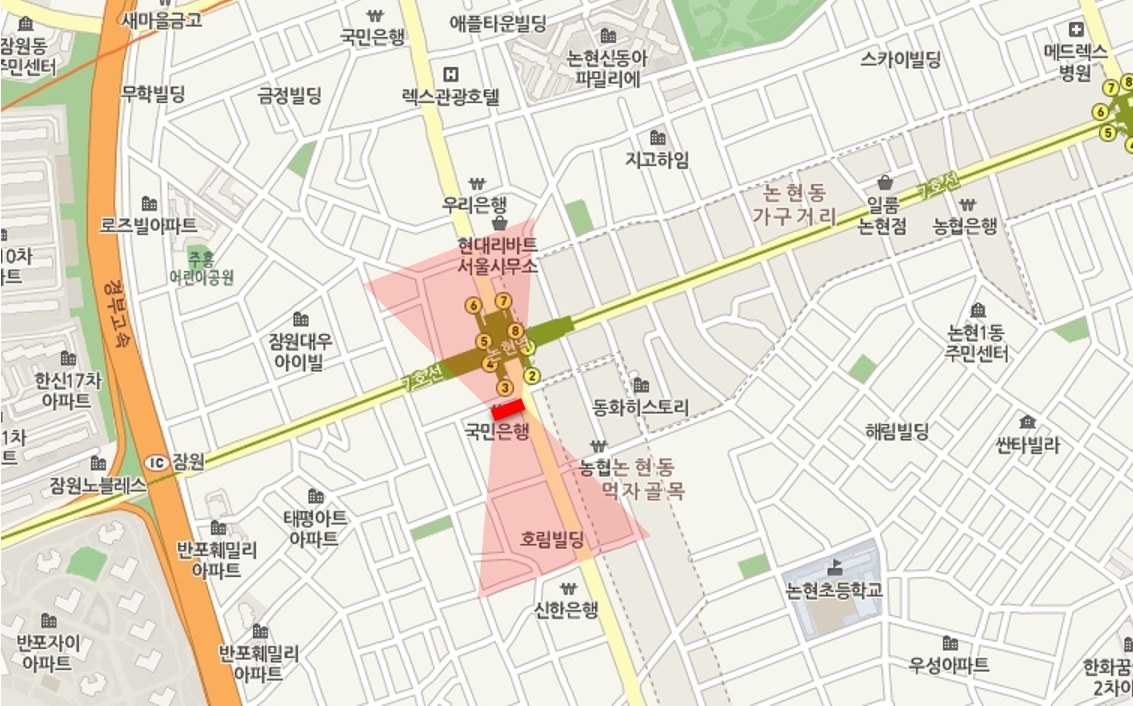 강남역, 신논현역 ↔ 논현역, 신사역, 한남대교를 이동하는 상하행 차량들에게 양면 동시 노출