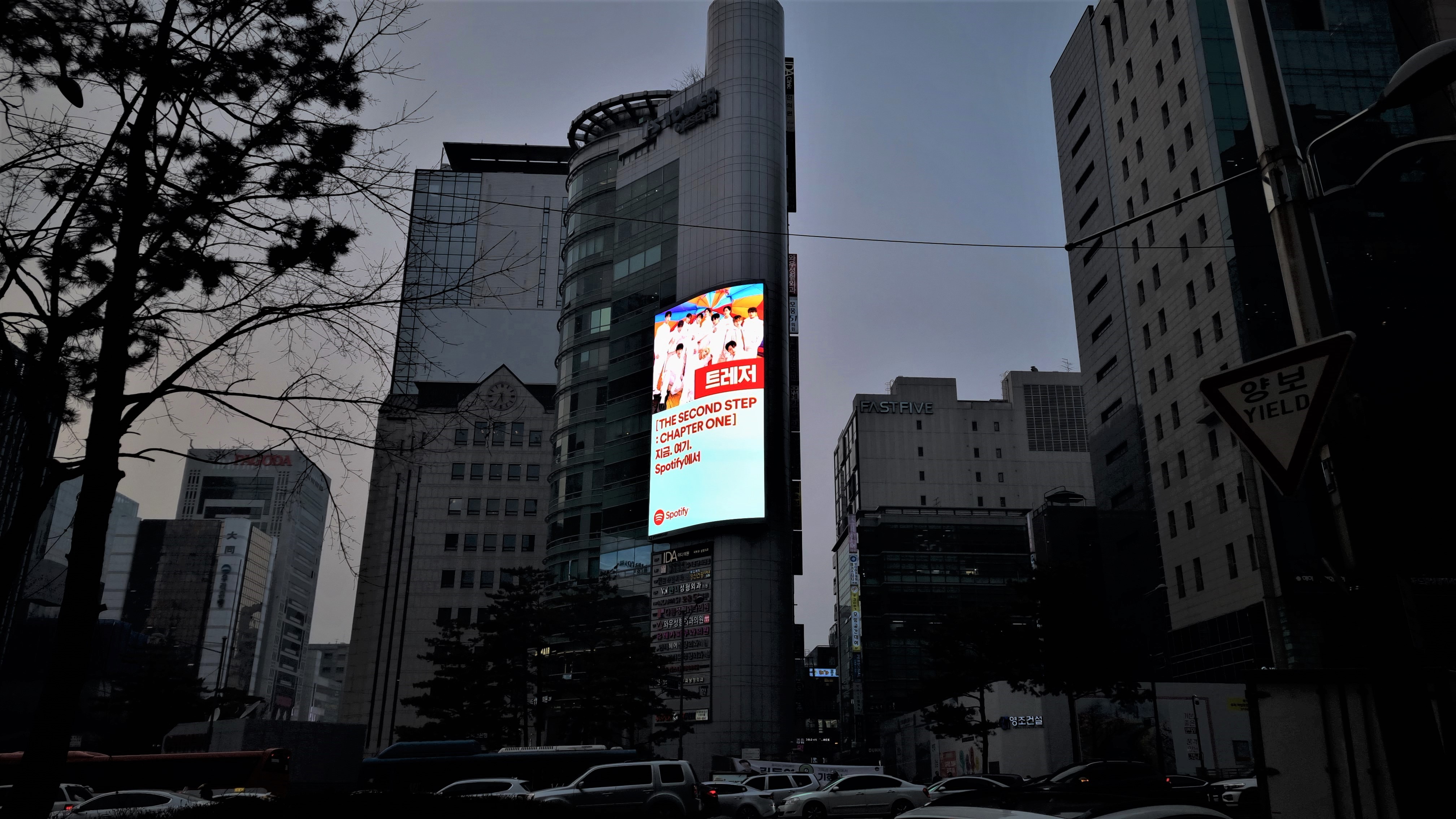 강남역 사거리 방면으로 대각선에 설치되어 다양한 각도에서 노출되는 전광판