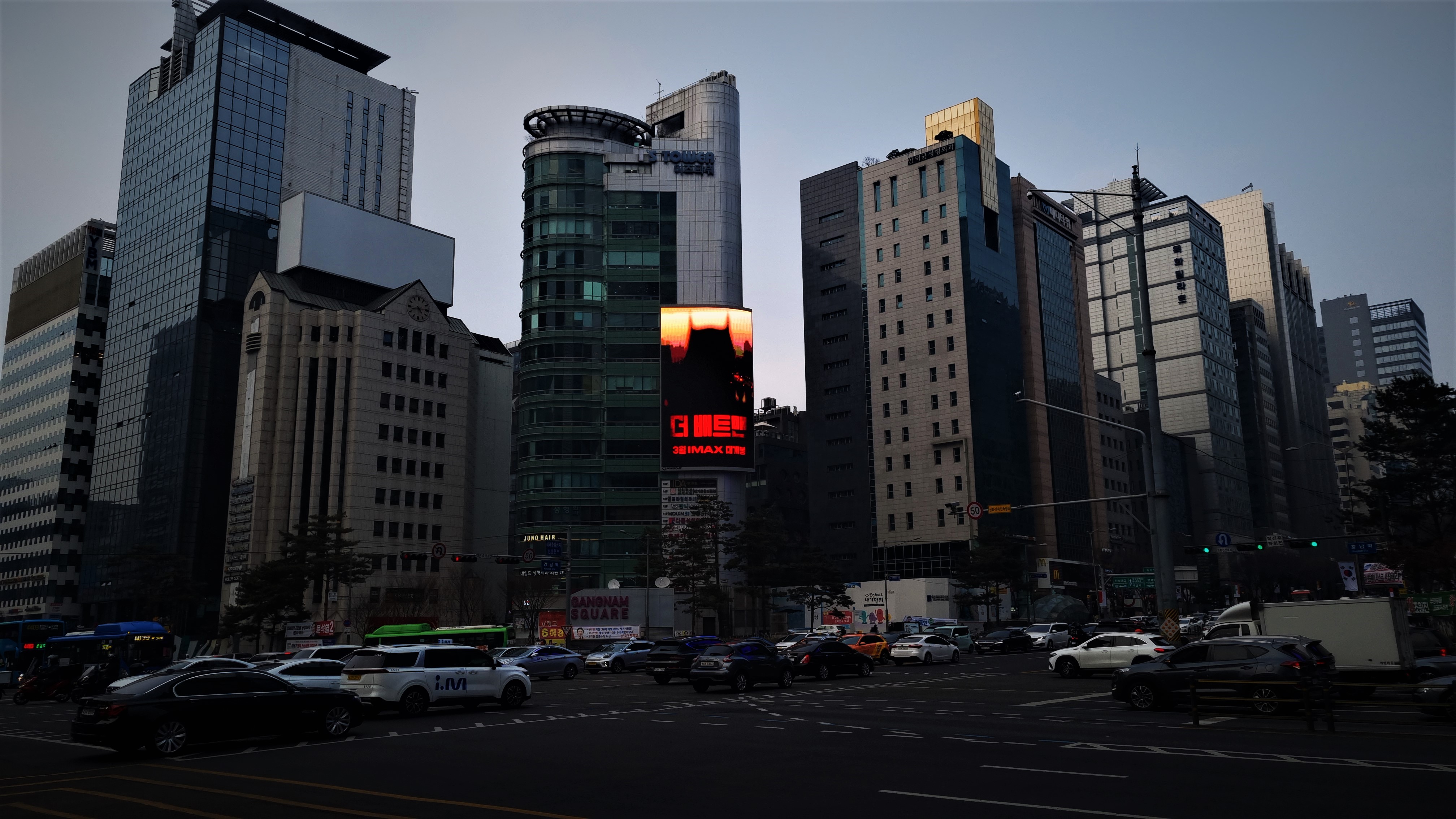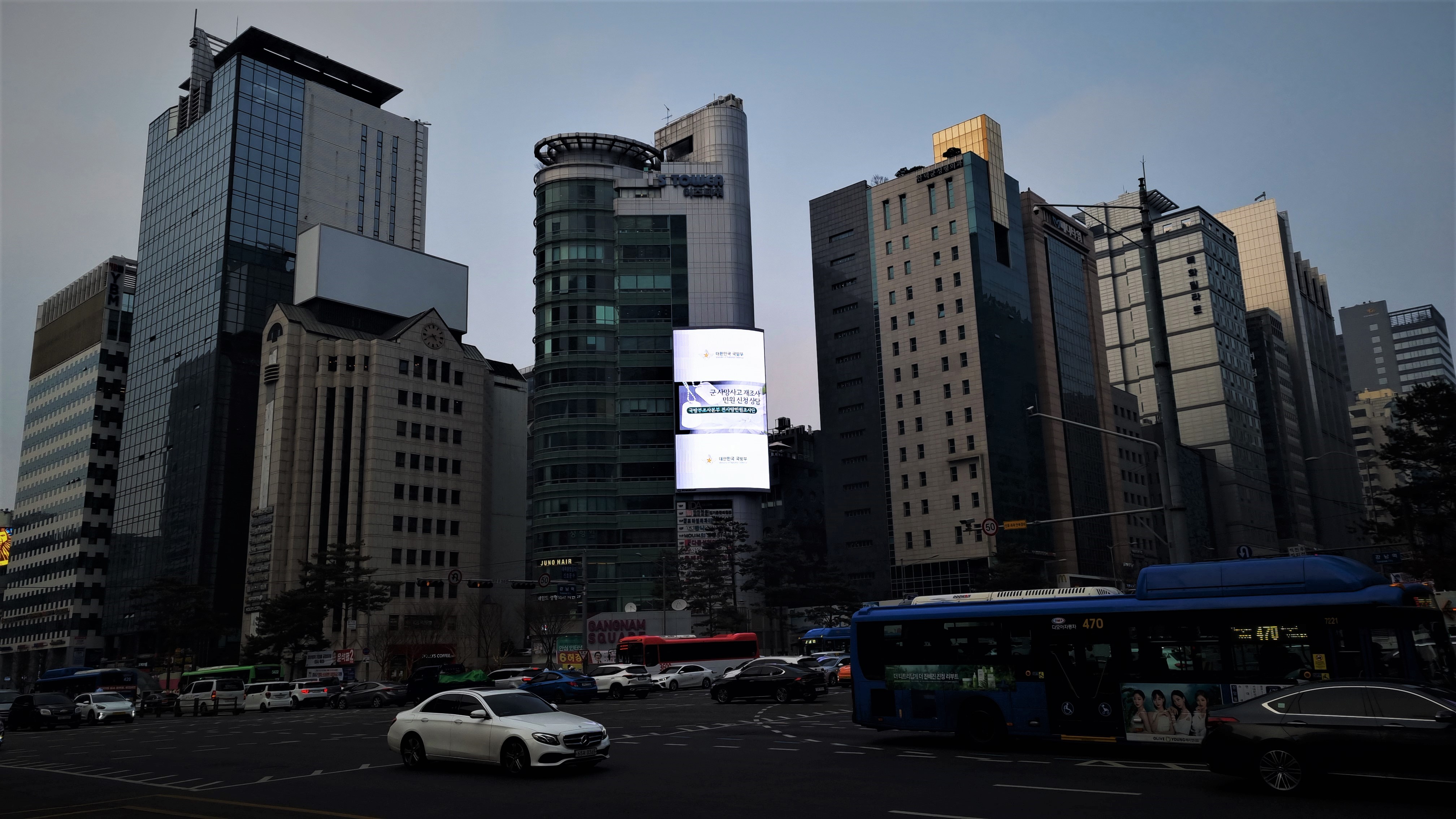 강남역 사거리 방면으로 대각선에 설치되어 다양한 각도에서 노출되는 전광판