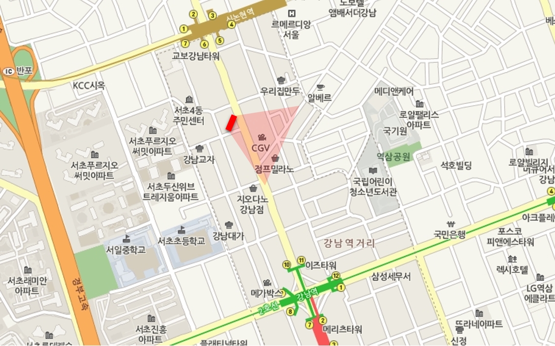 강남역 사거리를 중심으로 비지니스, 문화, 상업지구가 발달되어 있으며 유동인구 국내 2위라는 통계를 나타내고