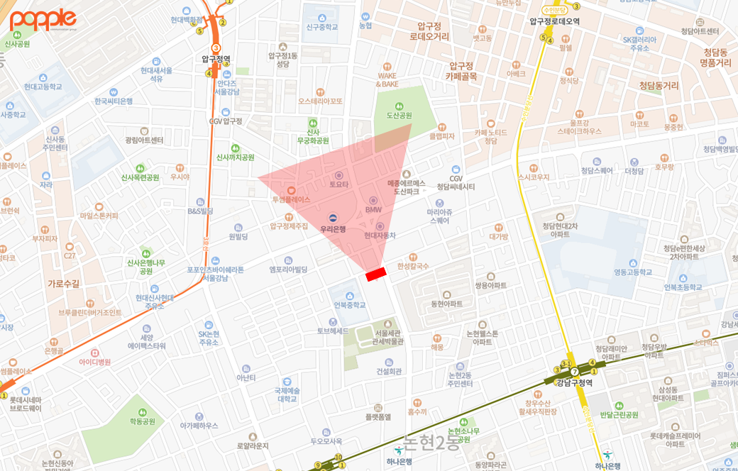 8차선 대로변 위치 교통의 요지 도산공원 사거리 노출