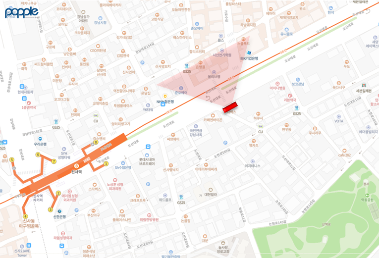 가로수길 입구에 설치되어 가로수길 관광객과 신사역 유동인구에게 노출
