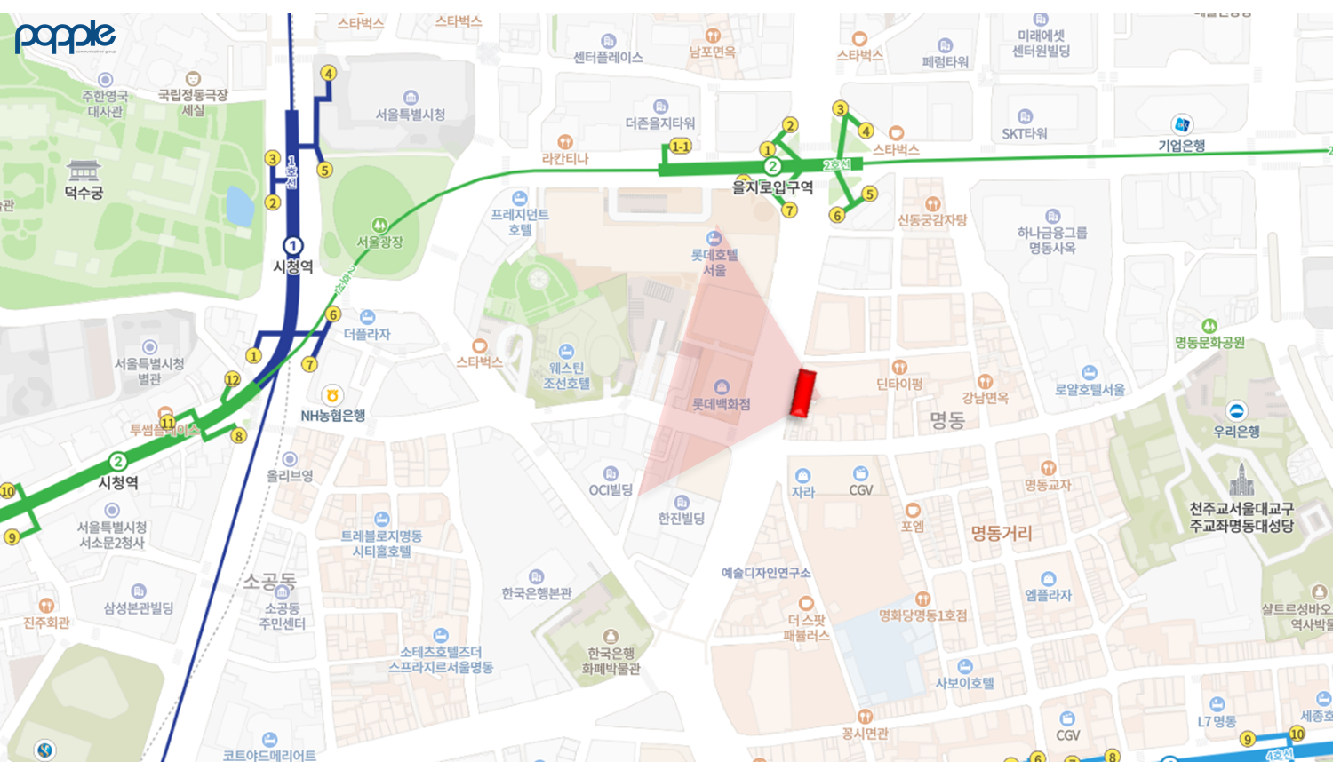 명동거리의 시작부근에 위치하여 많은 관광객에게 광고 노출