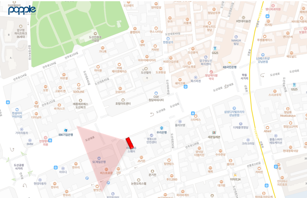 대한민국에서 유동인구가 가장 많은 도로인 도산대로에 위치