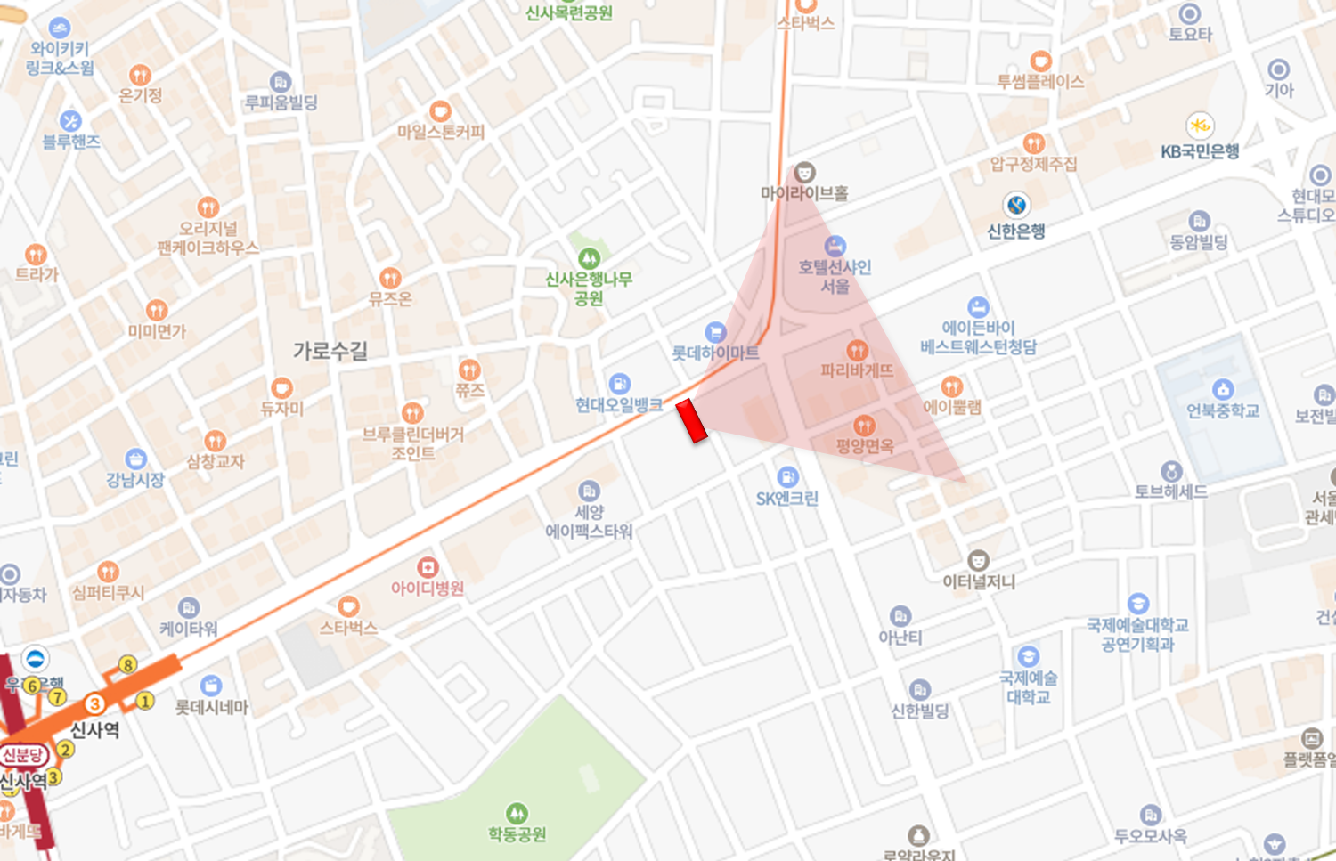 대한민국에서 유동인구가 가장 많은 도로인 도산대로에 위치