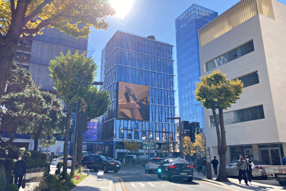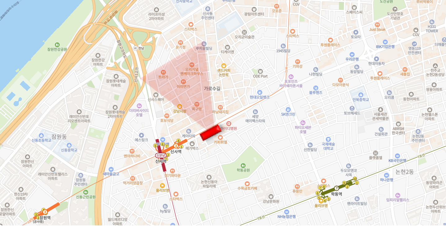 대한민국에서 유동인구가 가장 많은 도로인 도산대로에 위치