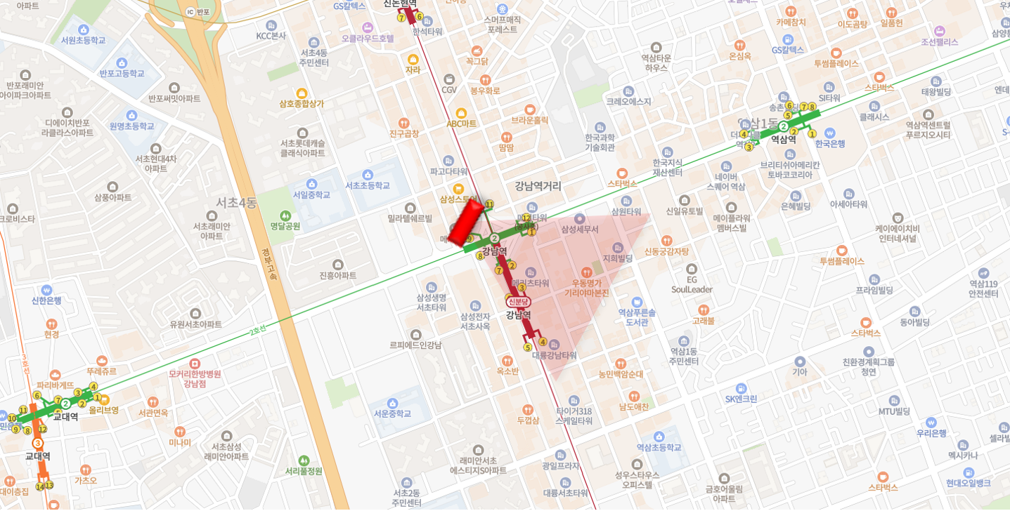 대한민국에서 유동인구가 가장 많은 인구가 분포되어 있는 강남역 인근에 위치