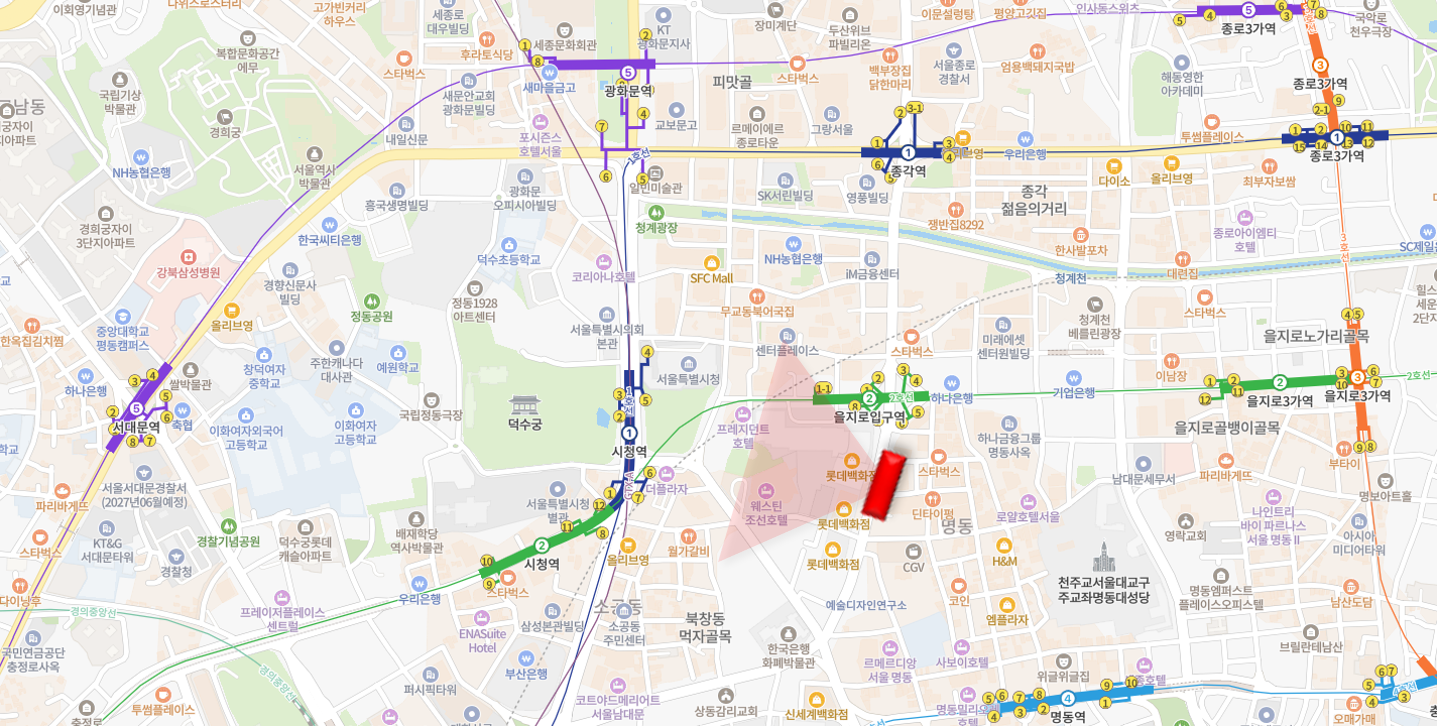 서울의 대표 번화가 중 하나로 공무원 대기업 직장인 등 다양한 인구가 분포되어 있는 곳