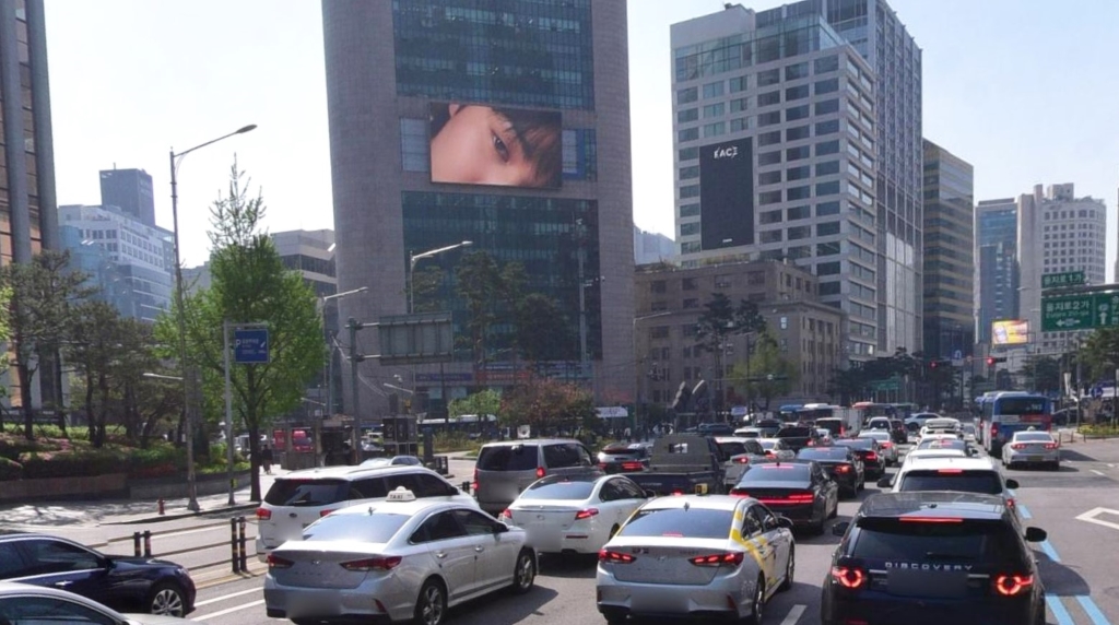을지로입구역 앞에 위치한 가로형 옥외 광고로 지속적이고 반복적인 노출 가능