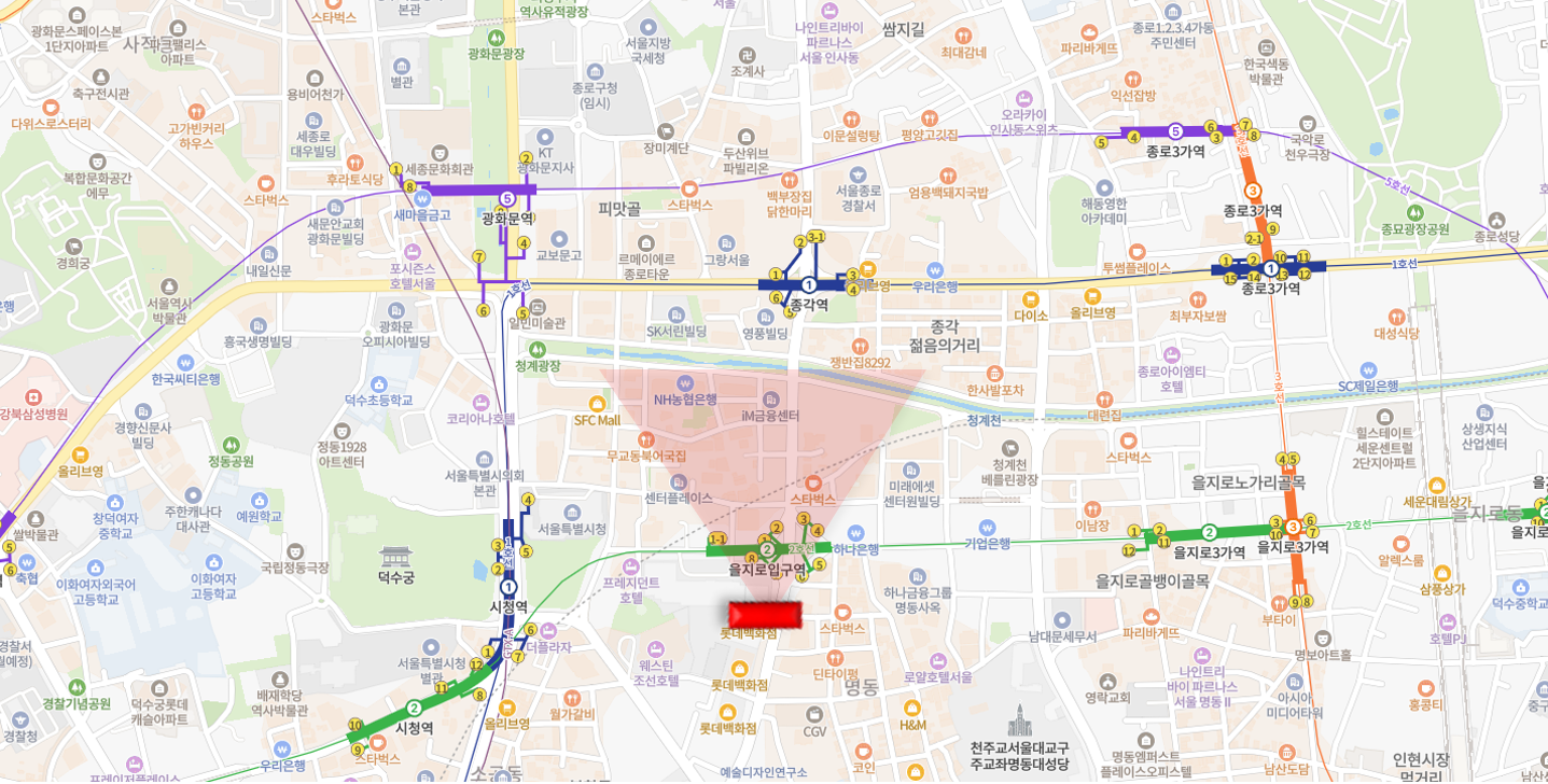 서울의 대표 번화가 중 하나로 공무원 대기업 직장인 등 다양한 인구가 분포되어 있는 곳