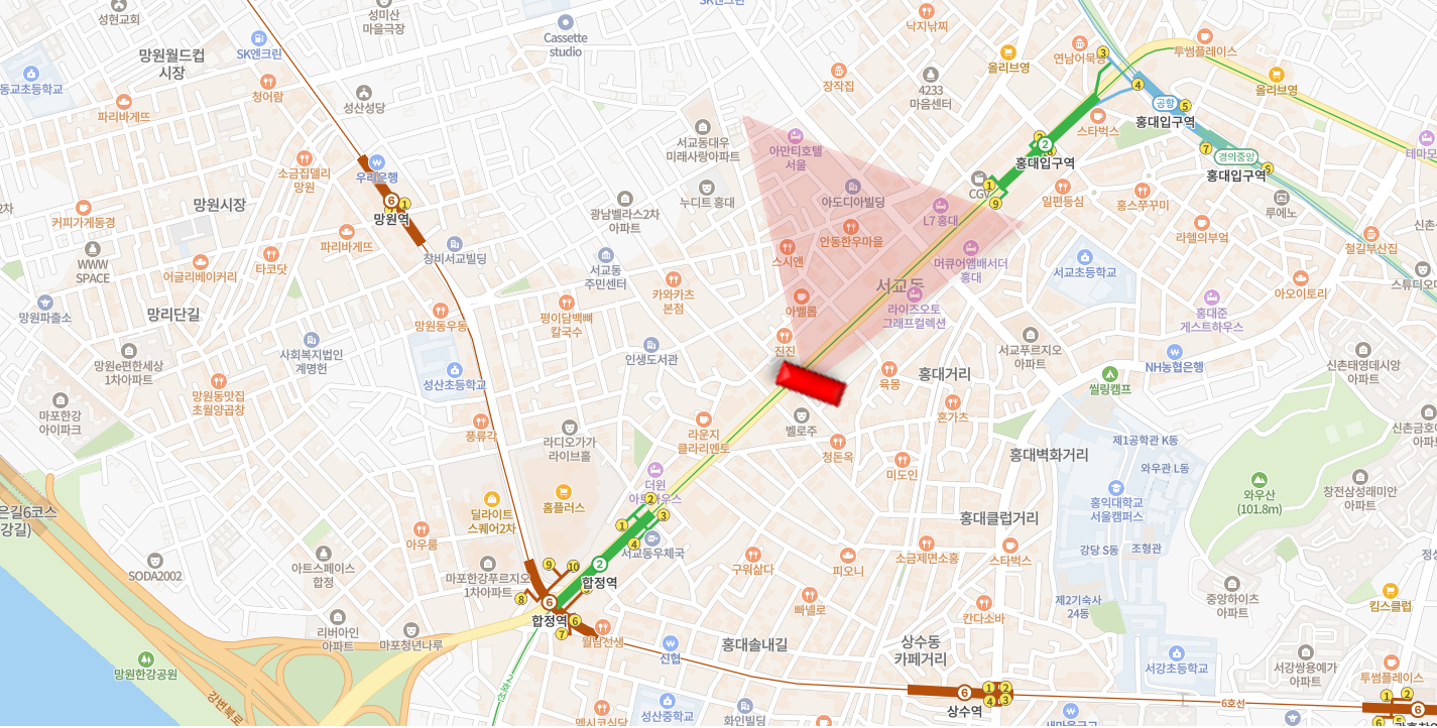 대한민국에서 유동인구가 가장 많은 지역 중 하나인 홍대에 위치