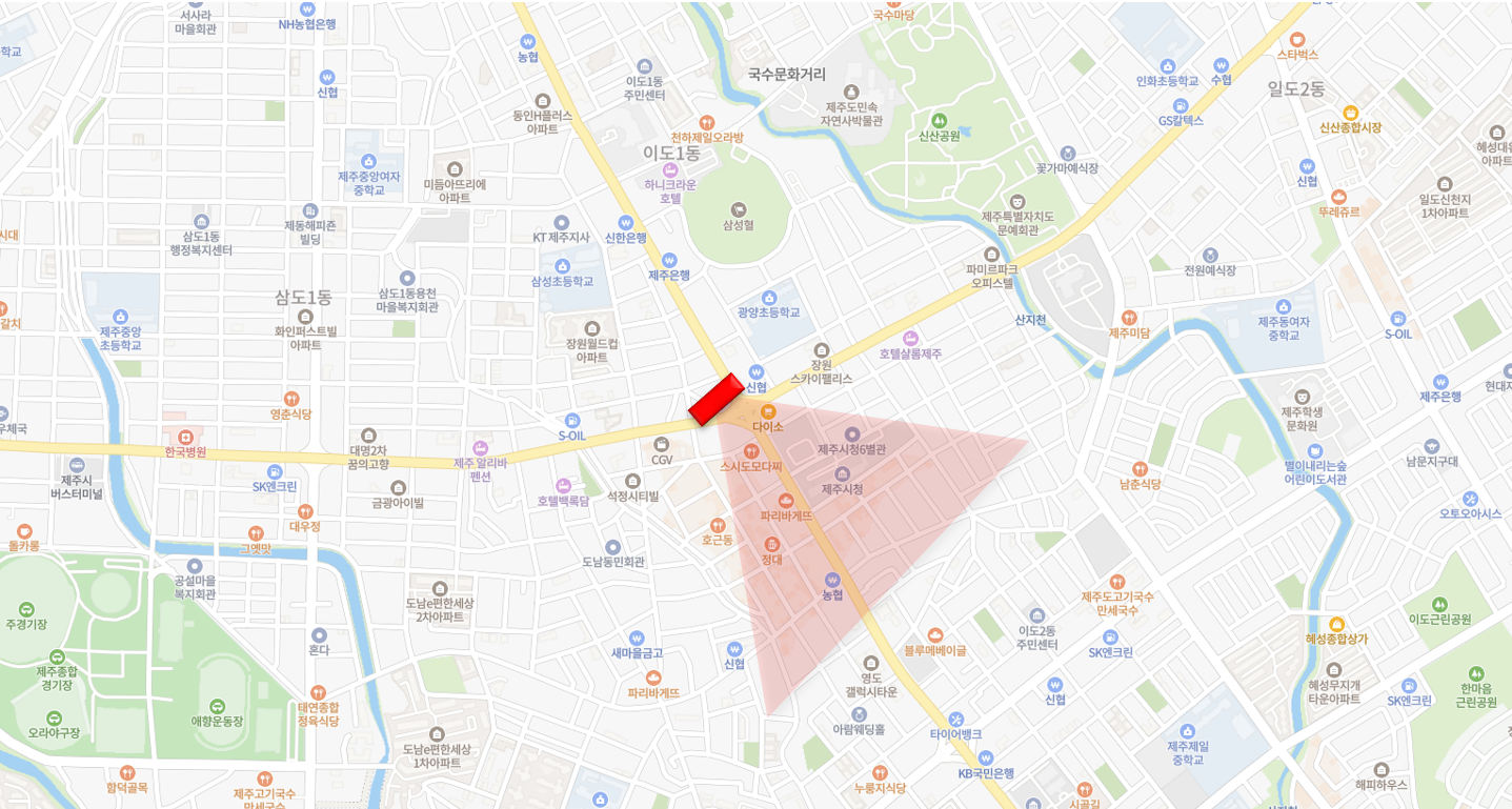 제주시에 이도1동에 위치해 있고 다양한 시설이 공존하는 지역